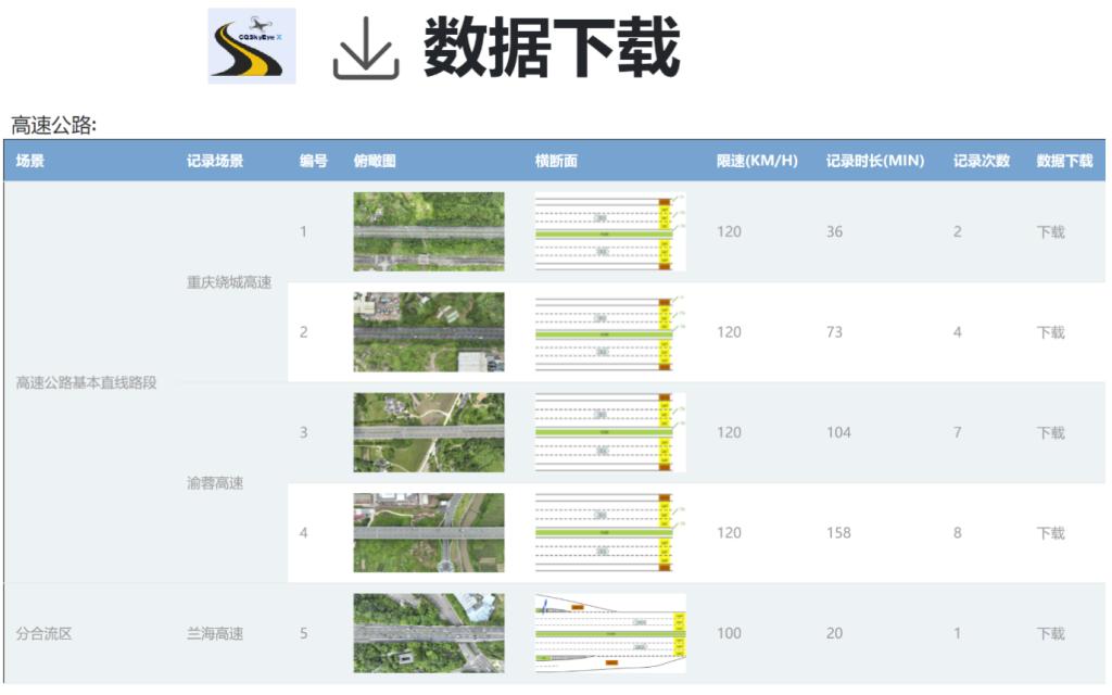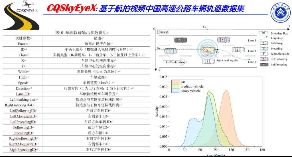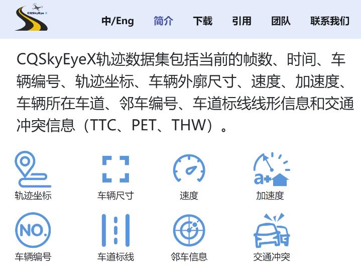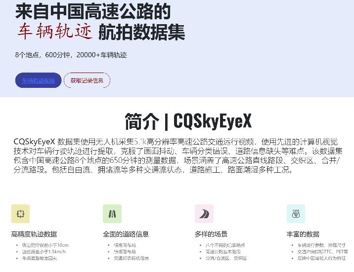 近日,由重庆交通大学交通运输学院徐进教授领衔的“山地道路车路智能协同与重大风险防控”重庆市高校创新研究群体,历时三年开发的高速公路车辆轨迹开放数据集——CQSkyEyeX,现已正式上线,并免费开放下载。这是国内首款基于无人机视频图像识别的高速公路轨迹开放数据集。欢迎校内外师生以及国内外交通领域的广大从业人员下载使用,无需注册申请,可直接点击链接进行下载(下载网址:http://www.cqskyeyex.com/)。CQSkyEyeX数据集能为行业管理者、工程师、高校教师和研究生们开展高速公路项目咨询、设计和科学研究时,提供中国高速公路交通运行的基础数据支撑。